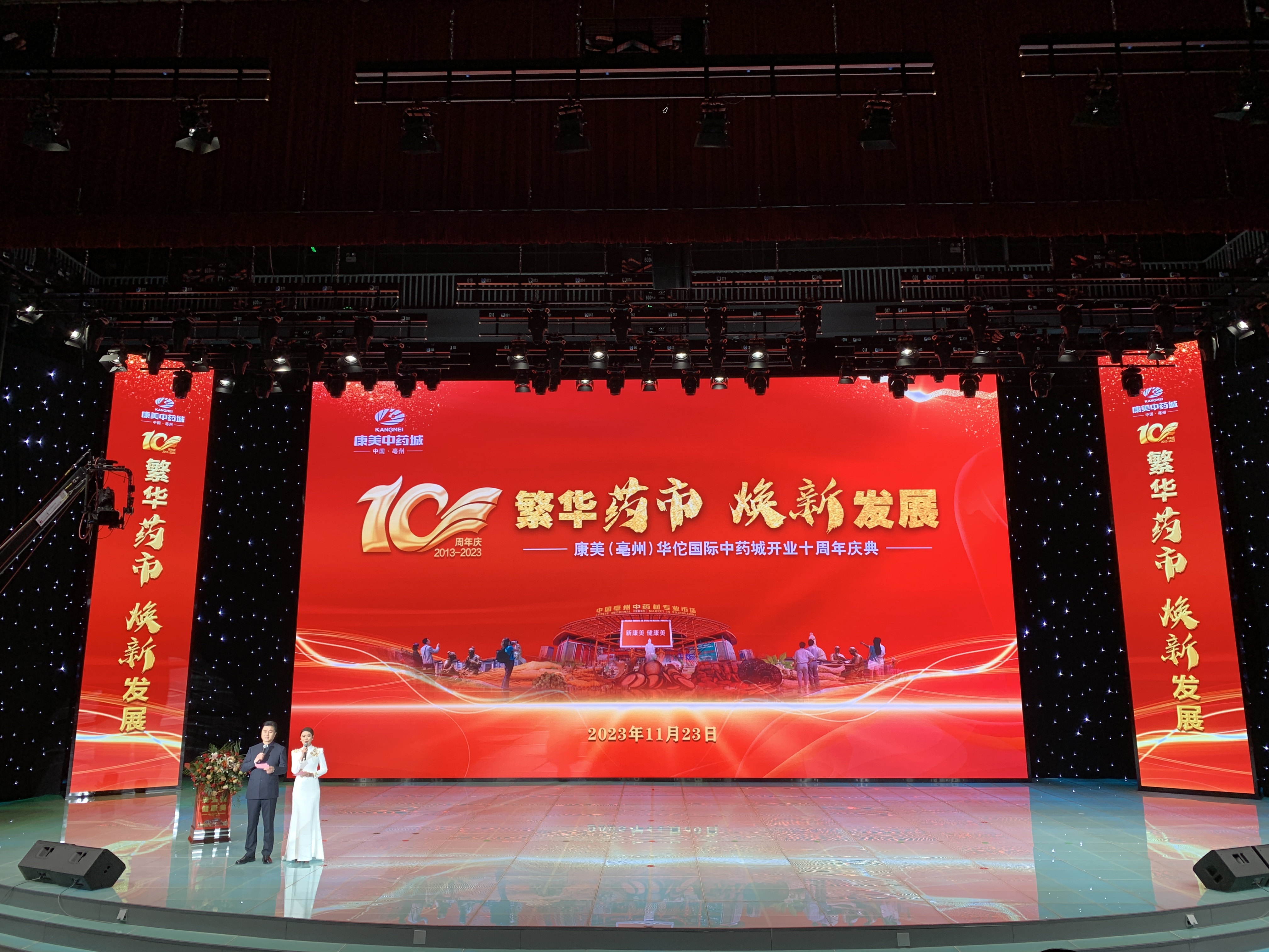 此次庆典活动在亳州广播电视台演播厅举行,亳州市政府、康美药业公司有关领导及康美中药城药商、采购商代表等500余人共同参加了此次盛大的庆典活动。活动还通过药都时空视频号、亳视频抖音、掌上亳州APP进行了现场直播。
